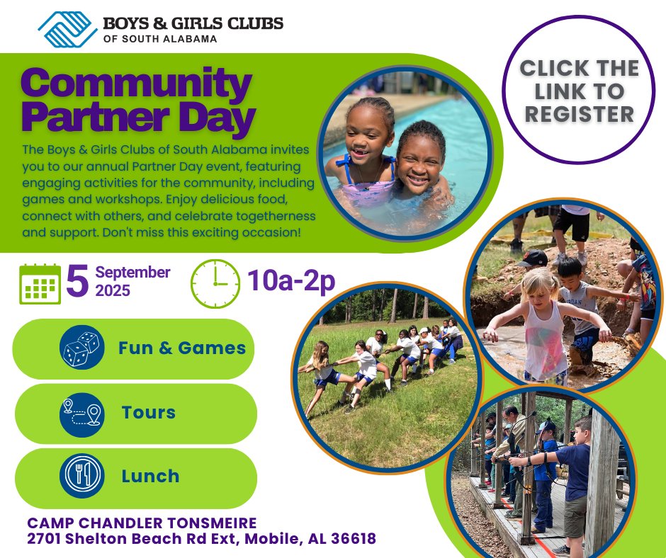 The Boys & Girls Club of South Alabama Community Partner Day is an event designed to strengthen and celebrate the collaboration between the club and its community partners. This day serves as an opportunity for local businesses, organizations, and individuals to engage with the club, learning about the programs and initiatives that support young people in the area. It fosters a sense of community and shared purpose, highlighting the importance of collective efforts in providing a safe and nurturing environment for youth. Through interactive activities, presentations, and discussions, Community Partner Day aims to inspire ongoing support and collaboration, ensuring that the Boys & Girls Club can continue to make a positive impact in the lives of children and teenagers in South Alabama. This event has been postponed until further notice.