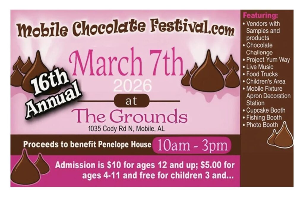 The 16th Annual Mobile Chocolate is a wonderful, one day family fun event! There will be vendors offering samples of their chocolate-related products as well as selling their products. Vendors vary from having chocolate-themed wares to succulent confections to jewelry to bath and body products. Free activities featured: Children’s Area with Home Depot wooden builds/ jumpies/face painting, Mobile Fixture’s “Decorate Your Apron” Booth, Cupcake Booth, Chocolate Martini tasting, Fishing Booth, and Magic Memories Photo Booth; enjoy live music, Chocolate Challenge featuring professionals, amateurs, and youth divisions; Project Yum Way where students and aspiring designers participate in a fashion display of chocolate inspired fashions made from chocolate candy wrappers; Cruise-In, and the Easter Egg Scramble!