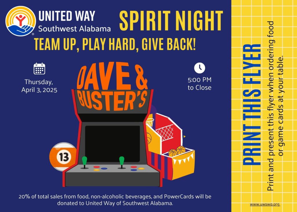 United Way of Southwest Alabama is teaming up with Dave & Buster’s to host a special Spirit Night on Wednesday, April 3, 2024, from 5:00 PM until close. This exciting event invites the community to enjoy a night of great food, games, and entertainment—all while making a difference!