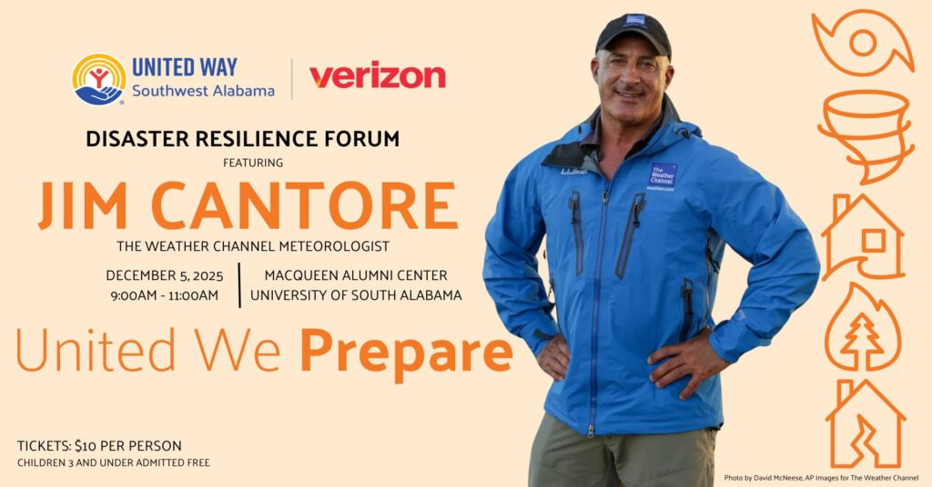 We are thrilled to announce that United Way of Southwest Alabama, in partnership with Verizon, is hosting a Disaster Resilience Forum featuring Jim Cantore of The Weather Channel on Friday, December 5, from 9:00 to 11:00 a.m. at The University of South Alabama MacQueen Alumni Center, located at 100 Alumni Drive, Mobile, AL 36688.